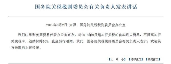 3月2日 据财政部网站消息,国务院关税税则委员会有关负责人今日发表讲话表示,我们注意到美国贸易代表办公室宣布,对2018年9月起加征关税的自华进口商品,不提高加征关税税率,继续保持10%,直至另行通知。